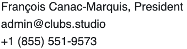 If you have any questions or concerns about the Policy, or if you wish to make a complaint, please contact our person in charge of the protection of personal information at: info@clubs.studio
